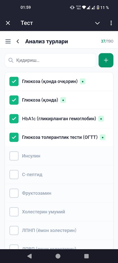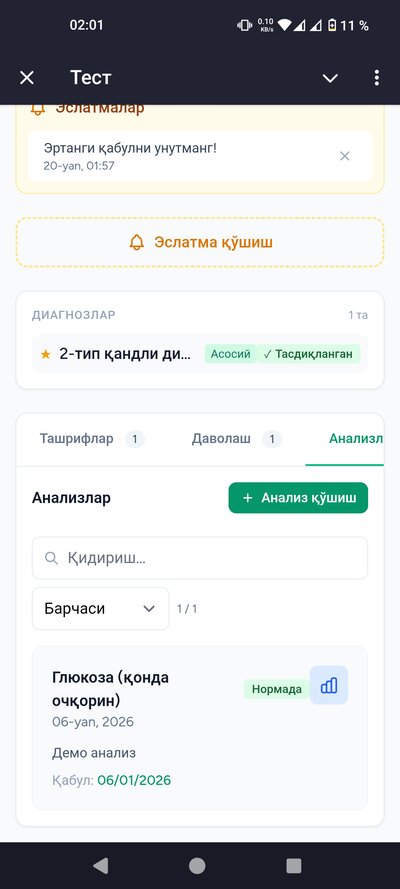 - • Анализлар — текшириш натижаларини киритасиз ва графикларда кўрасиз