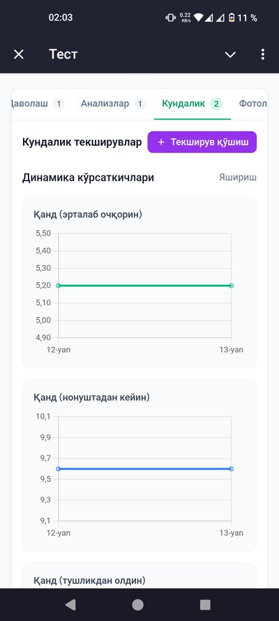 - Қанд миқдори — эрталаб, овқатдан кейин, кечқурун