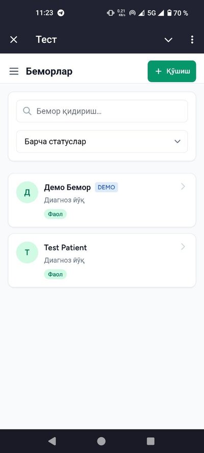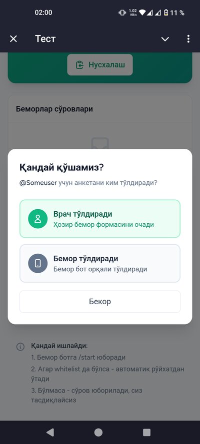 Тизим Telegram бот орқали ишлайди. Бу дегани — сиз ва беморларингиз Telegram иловасидан фойдаланасиз. Компьютерга ҳеч нарса ўрнатиш шарт эмас, телефондан ишлайверасиз.