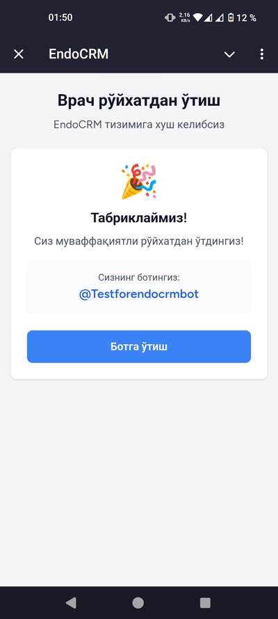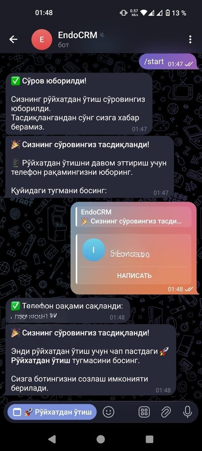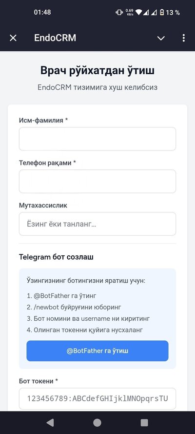 Сўровингиз тасдиқлангандан кейин @endocrmbot сизга рўйхатдан ўтиш формасини юборади. Формада қуйидагиларни тўлдиринг: