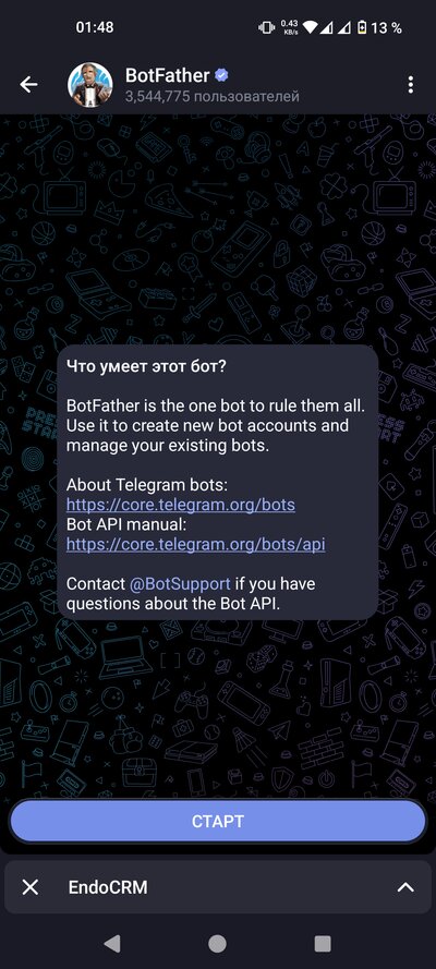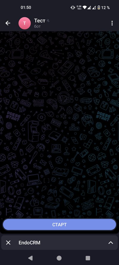Откройте приложение Telegram. В строке поиска напишите @endocrmbot и найдите бота. Откройте бота и отправьте команду /start. Ваша заявка будет отправлена администратору. Дождитесь подтверждения — обычно это занимает несколько часов.