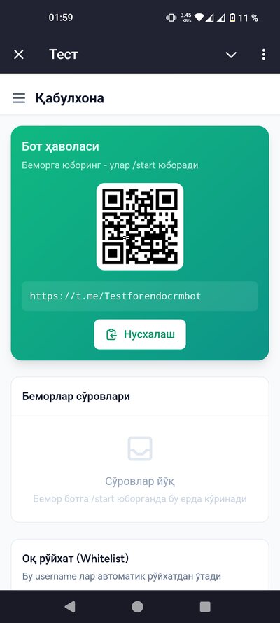 Telegram иловасини очинг. Қидирув қаторига @endocrmbot ёзинг ва ботни топинг. Ботни очиб, /start буйруғини юборинг. Сизнинг сўровингиз админга юборилади. Тасдиқланишини кутинг — одатда бир неча соат ичида тасдиқланади.