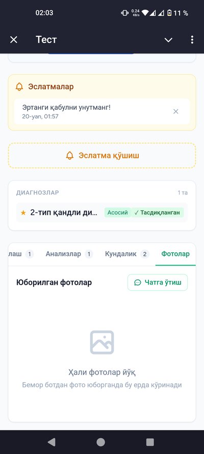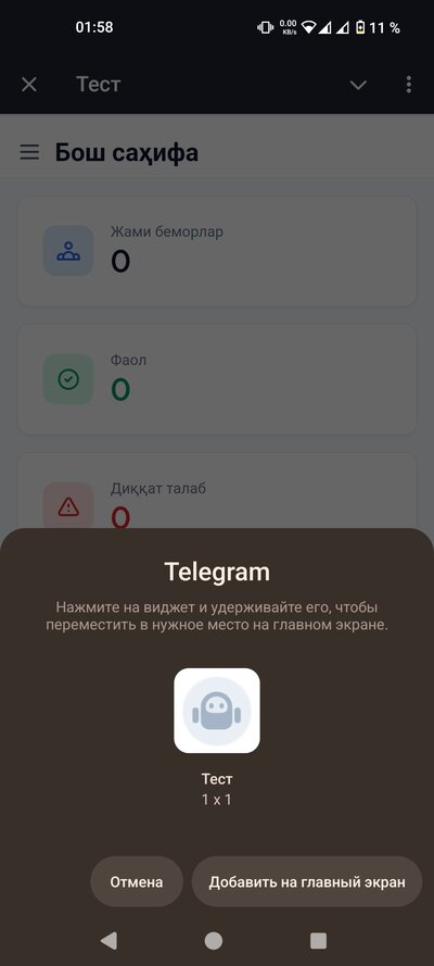 Тизим Telegram бот орқали ишлайди. Бу дегани — сиз ва беморларингиз Telegram иловасидан фойдаланасиз. Компьютерга ҳеч нарса ўрнатиш шарт эмас, телефондан ишлайверасиз.