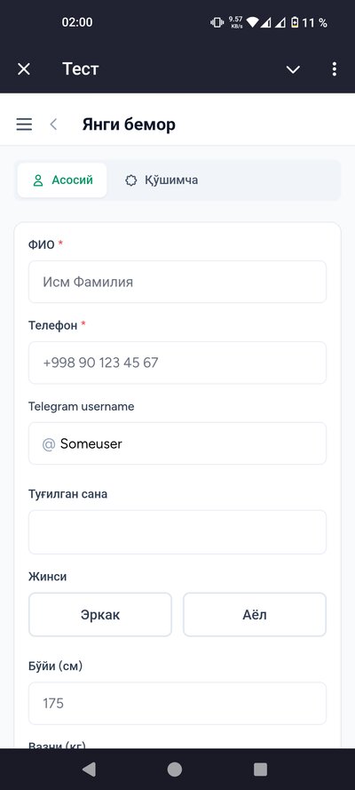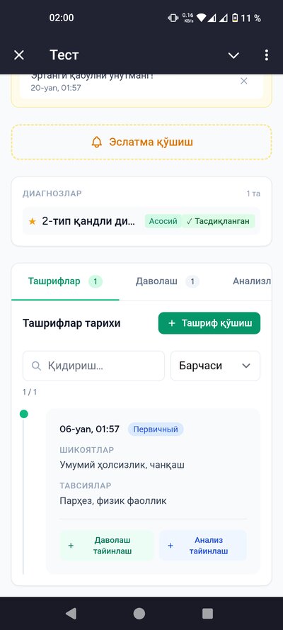 Сиз веб-кабинетда ишлайсиз. Беморларни қўшасиз, ташрифларни ёзасиз, анализларни киритасиз, даволашни тайинлайсиз. Барча маълумотлар бир жойда — телефон ёки компьютердан кириш мумкин.