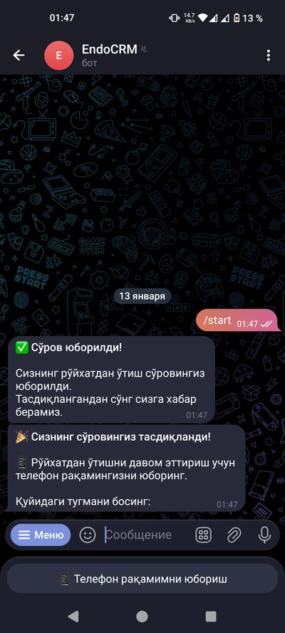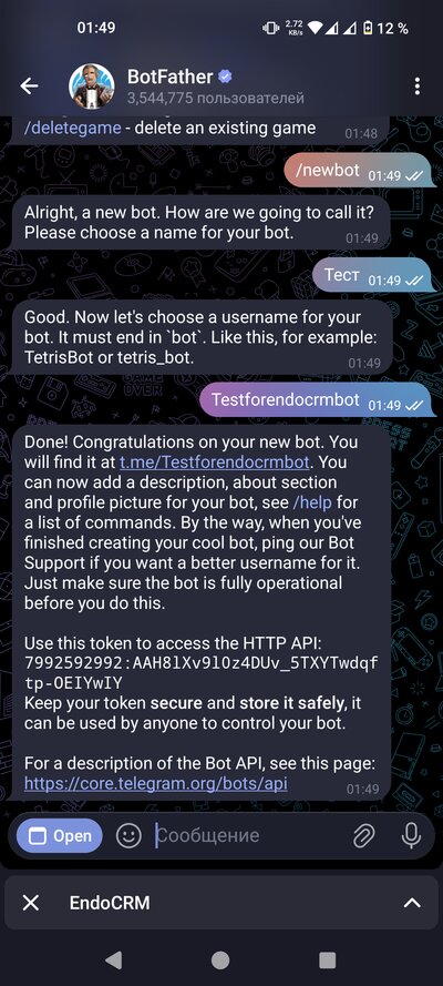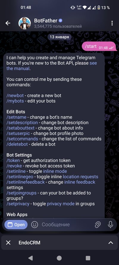 Откройте приложение Telegram. В строке поиска напишите @endocrmbot и найдите бота. Откройте бота и отправьте команду /start. Ваша заявка будет отправлена администратору. Дождитесь подтверждения — обычно это занимает несколько часов.