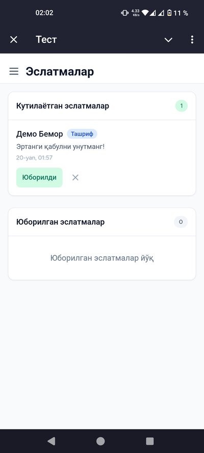 - • Эслатмалар — беморга дори ёки ташриф ҳақида эслатади