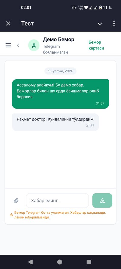 Қандай ишлайди: Бемор ботга хабар ёзади — сиз веб-кабинетда кўрасиз. Сиз жавоб ёзасиз — бемор ботда олади.