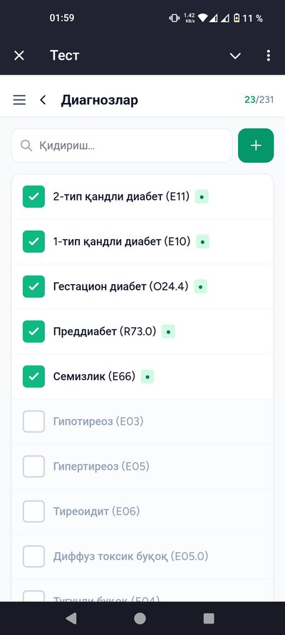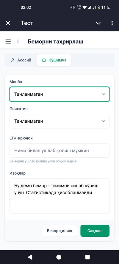 - • Беморлар базаси — барча беморларингизни бир жойда сақлайсиз