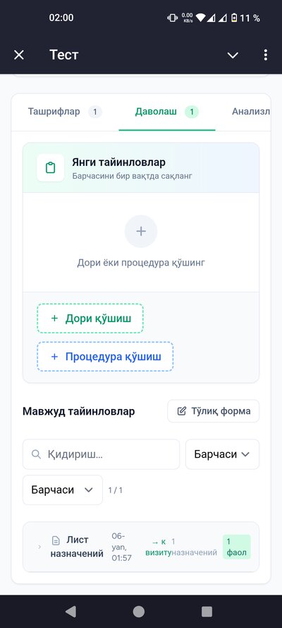 - • Даволаш режаси — дорилар ва процедураларни тайинлайсиз
