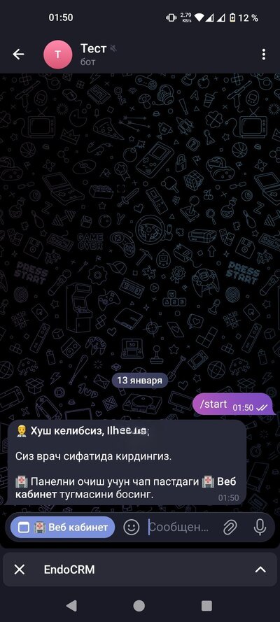 Telegram да ўз ботингизни топинг (масалан @dr_aliev_bot). Ботни очинг ва "СТАРТ" тугмасини босинг. Кейин "Веб кабинет" тугмасини босинг — веб-илова очилади. Шу веб-иловада ишлайсиз.