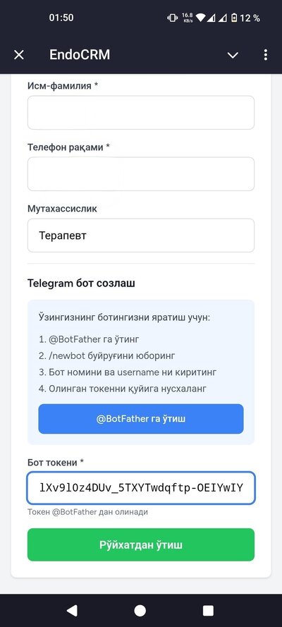 Сўровингиз тасдиқлангандан кейин @endocrmbot сизга рўйхатдан ўтиш формасини юборади. Формада қуйидагиларни тўлдиринг: